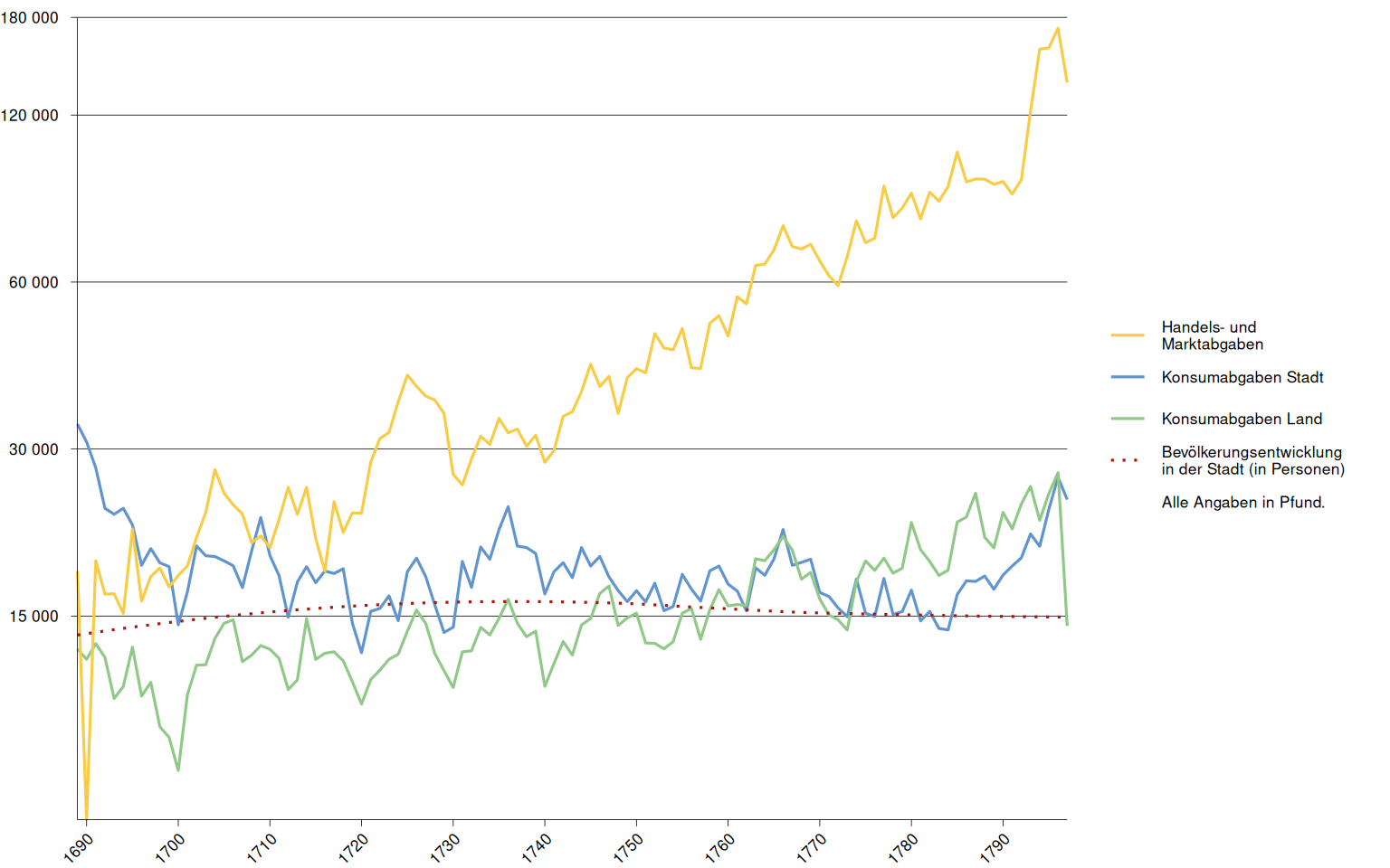 Description | Die logarithmische Darstellung verdeutlicht das exponentielle Wachstum der Abgaben auf Export- und Handelswaren im Vergleich zu den Konsumabgaben. Seit den 1770er-Jahren übertrafen die Konsumabgaben der Landschaft diejenigen der Stadt. |