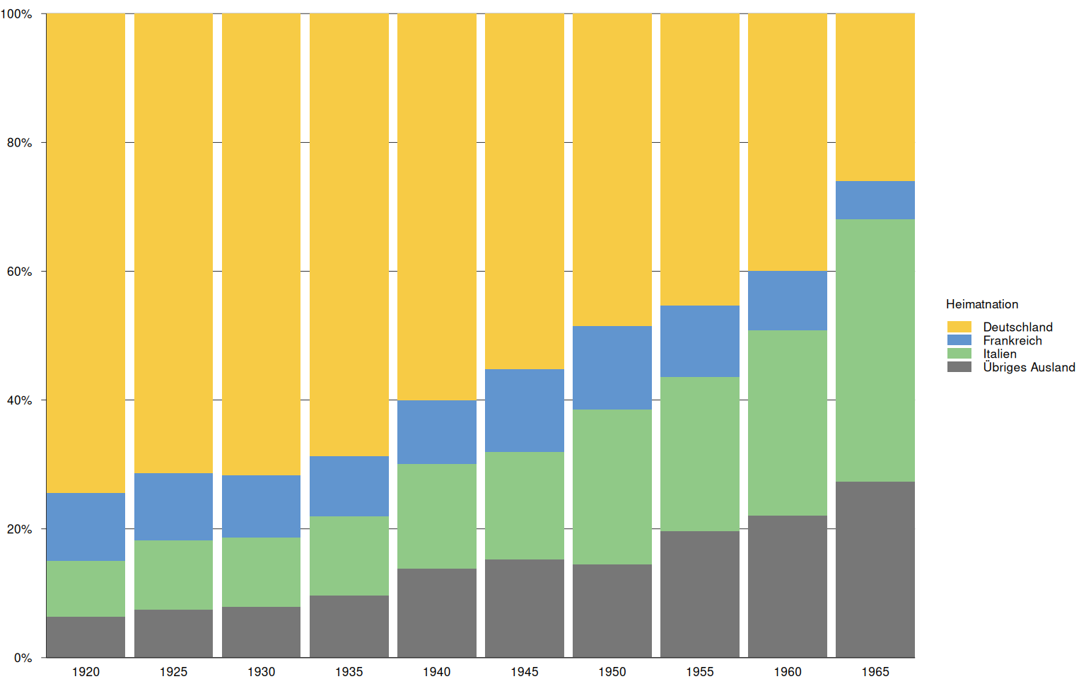 Title | Die ausländische Wohnbevölkerung von Basel-Stadt nach Heimatnation, 1920–1965 |