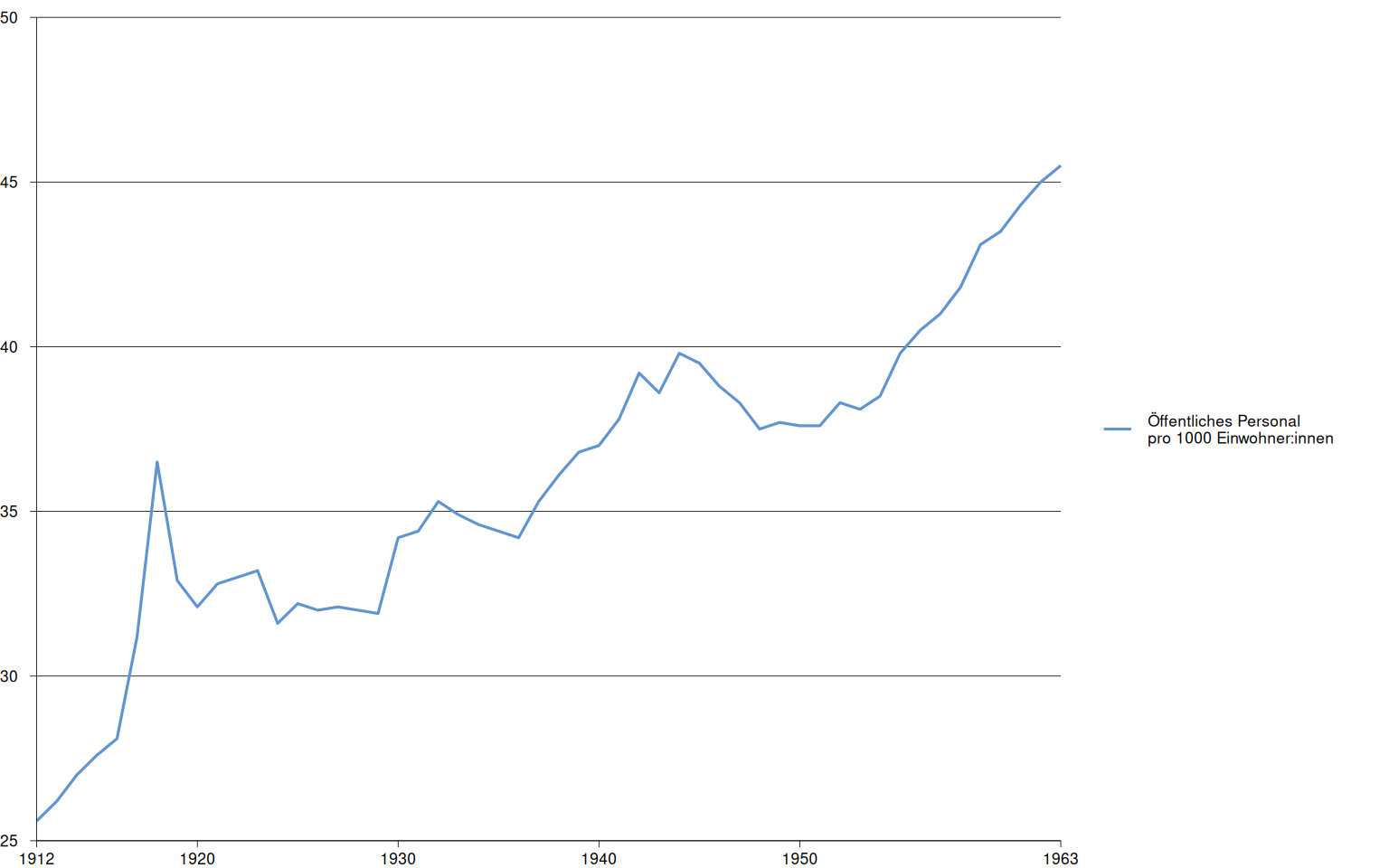 Description | Die Zahl der Staatsangestellten und die Staatsausgaben wuchsen zwischen 1912 und 1966 deutlich überproportional im Verhältnis zur Einwohnerschaft. |