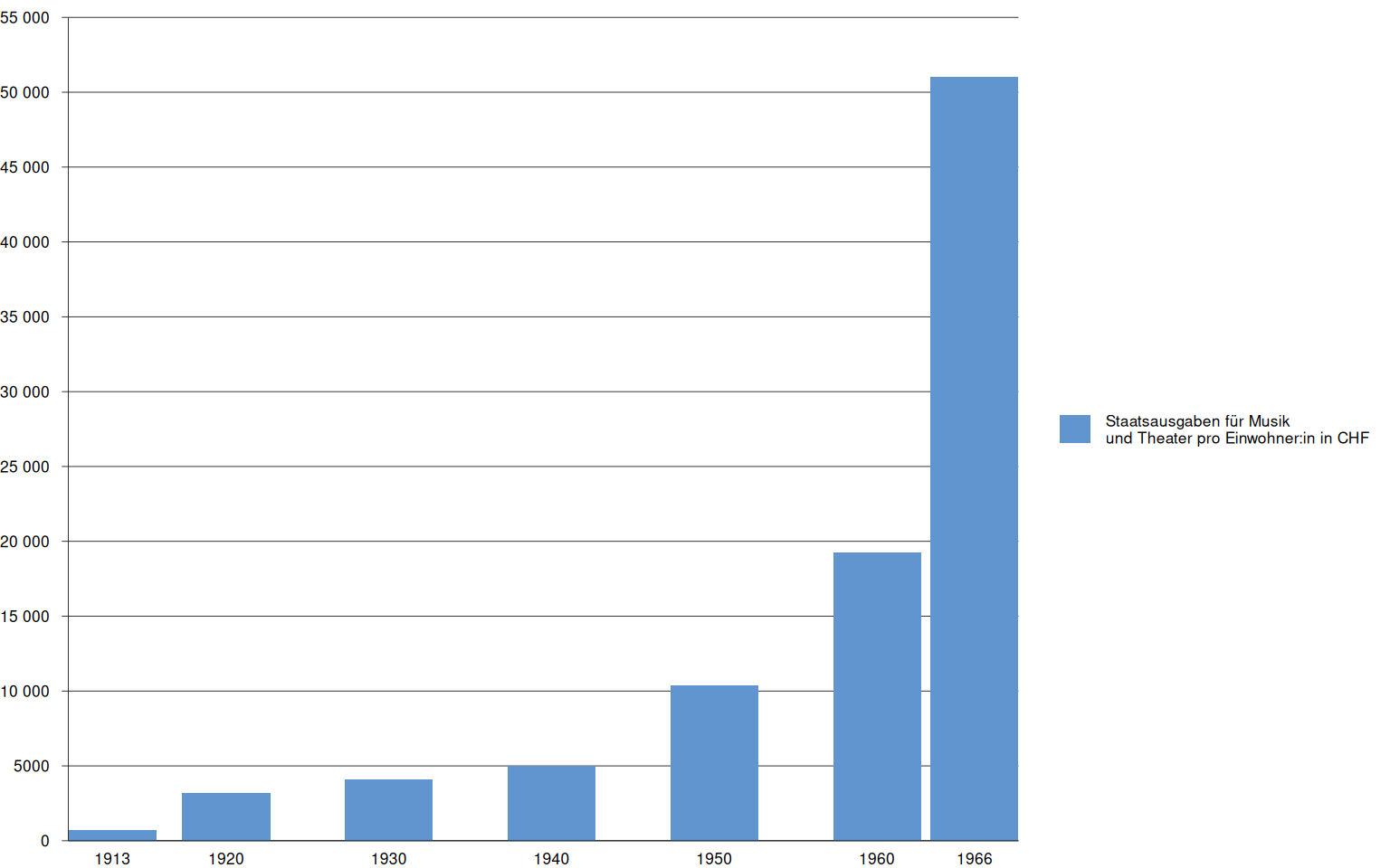 Description | Die staatlichen Ausgaben für Musik und Theater stiegen insbesondere während der Hochkonjunktur der Nachkriegszeit exponentiell an. 1966 waren die Ausgaben pro Kopf über siebzigmal so hoch wie 1913. |