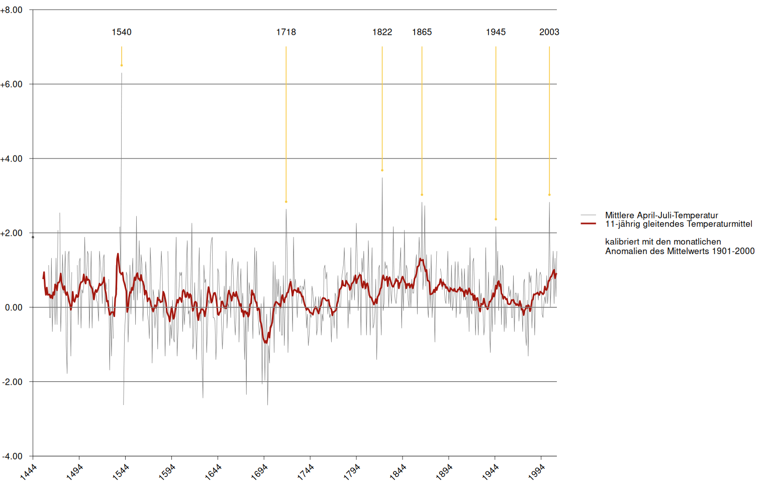 Description | Die Temperaturrekonstruktion zeigt, dass die Anomalie im Jahr 1540, der keine langanhaltende Klimaerwärmung folgte, sogar den «bisher heissesten» Sommer 2003 übertraf. |