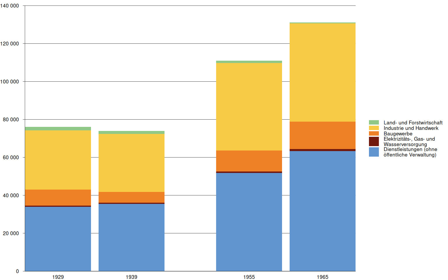Title | Beschäftigte nach Wirtschaftszweigen im Kanton Basel-Stadt, 1929–1965 |