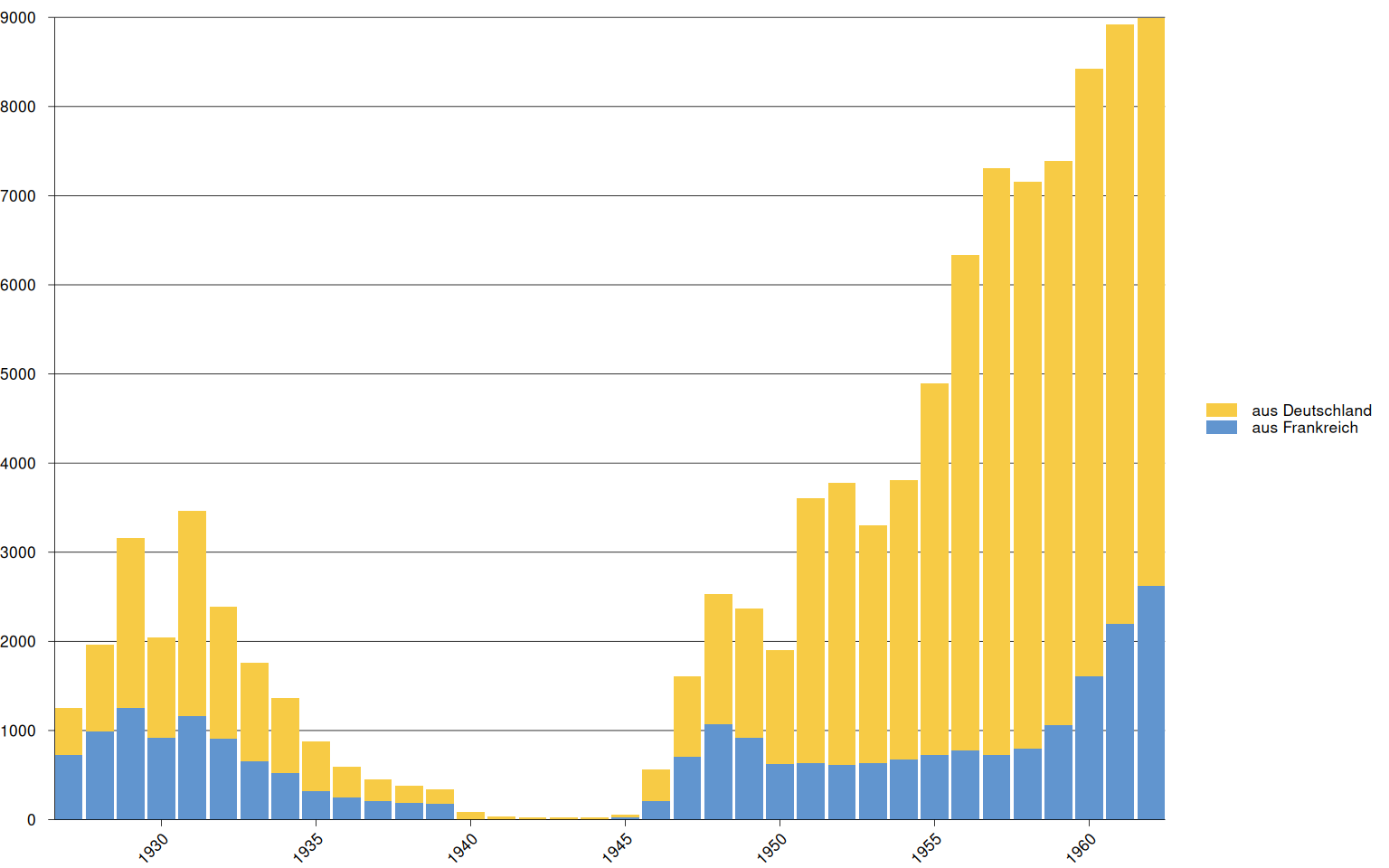 Source (Dataset) | Banz, Marcel: Die deutschen und französischen Grenzgänger auf dem baselstädtischen Arbeitsmarkt, Basel 1964. Bearbeitung: Nico Görlich / Moritz Twente |