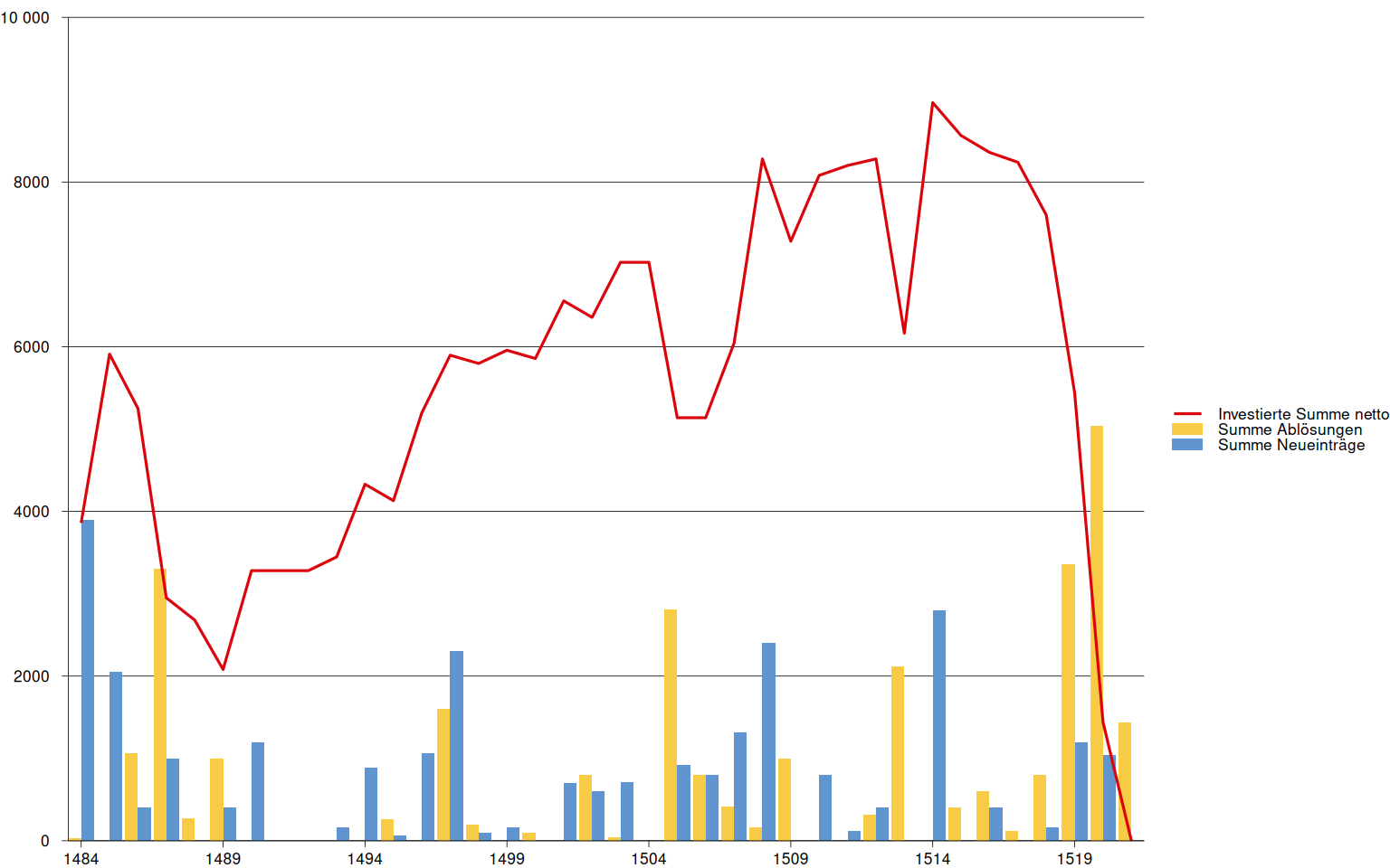 Description | Die Grafik zeigt die Gesamtsumme (in Gulden) des in Renten angelegten Vermögens von Ludwig Kilchmann, dazu die Summen der jährlich erfolgten Ablösungen und Neukäufe. Dank regelmässiger Zinszahlungen fuhr Kilchmann gut mit seiner Anlagestrategie, er konnte in den Jahren des Wachstums die investierte Summe um über vier Prozent pro Jahr steigern (erstellt auf der Basis von Signori 2014; Umrechnung nach Harms 1907). |