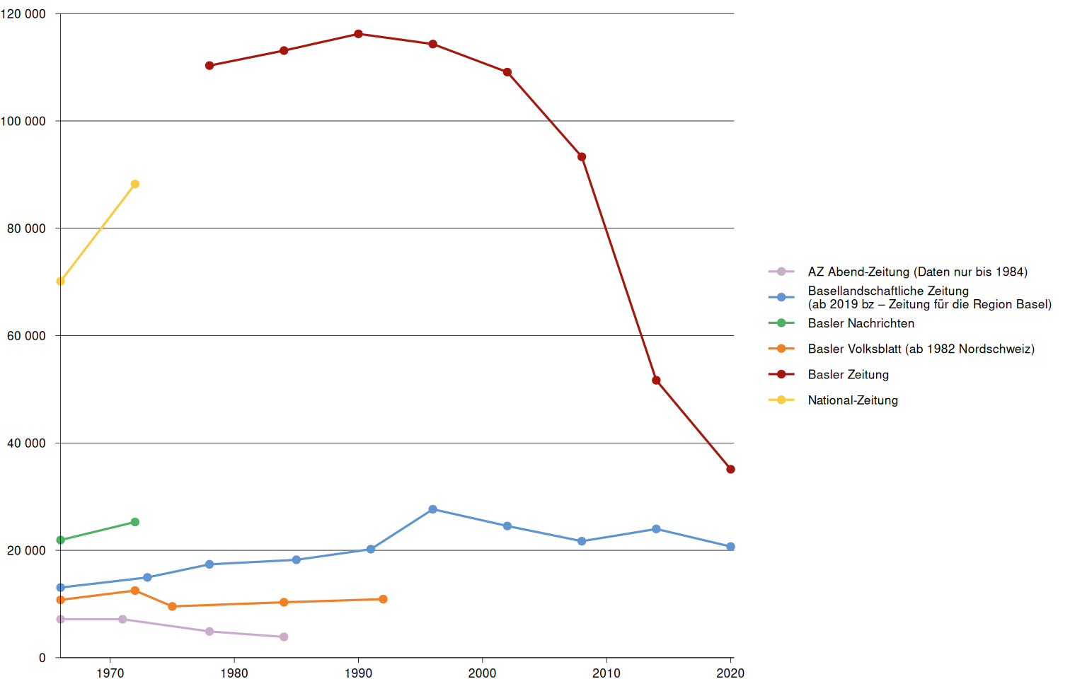 Citation (Dataset) | Stadt.Geschichte.Basel: Auflage der Tageszeitungen in der Region Basel, 1966–2020. Forschungsdatenplattform Stadt.Geschichte.Basel, https://forschung.stadtgeschichtebasel.ch/items/abb80380.html#m80380_3, letzte Aktualisierung: 06.10.2025. |