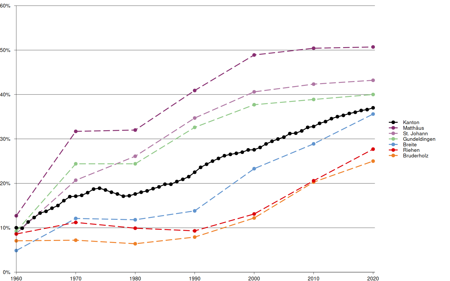 Description | Zwischen 1960 und 2020 vervierfachte sich der Anteil an Ausländerinnen und Ausländern an der Basler Bevölkerung nahezu. Den höchsten Anteil wies das Kleinbasler Quartier Matthäus auf, von 1960 bis 2020 stieg er dort von 12,7 auf 50,7 Prozent. Ebenfalls überdurchschnittlich war der Anteil in Gundeldingen und St. Johann, beides dichtbebaute Quartiere. Das Quartier Breite war ein traditionelles Arbeiterquartier mit vielen Genossenschaften, die Ausländerinnen und Ausländer zurückhaltend aufnahmen. Den geringsten Anteil hatten das wohlhabende Bruderholz und die Landgemeinde Riehen, in beiden betrug er 2000 etwa dreizehn Prozent. Insbesondere Riehen verzeichnete in den folgenden Jahren einen markanten Anstieg, der mit der gestiegenen Wirtschaftskraft vieler Einwanderer zusammenhing: Zunehmend gut ausgebildete Fachkräfte aus dem Ausland, sogenannte Expats, zogen in Gegenden mit einem höheren Anteil an Einfamilienhäusern. |