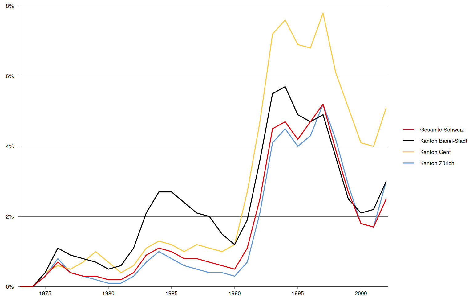 Title | Arbeitslosenquote der Kantone Basel-Stadt, Genf und Zürich sowie der gesamten Schweiz, 1973–2002 |