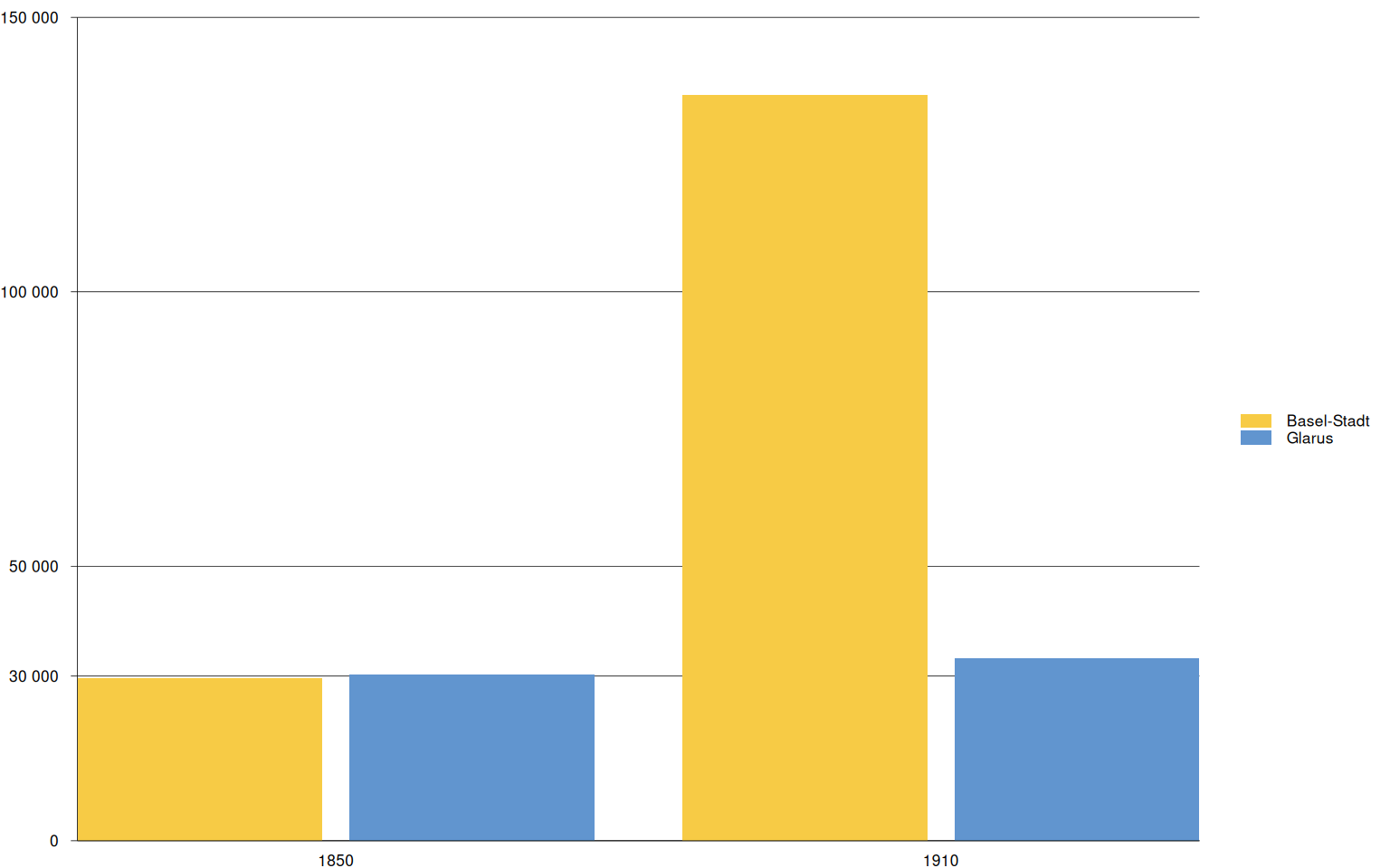 Description | Der Vergleich zwischen Basel-Stadt und Glarus veranschaulicht den sozialen Strukturwandel innerhalb der Schweiz. Um 1850 hatten beide Kantone rund 30 000 Einwohnerinnen und Einwohner. Bis 1910 wuchs die Bevölkerung von Glarus auf etwas über 33 000 Menschen an, während sich die Bevölkerung des Kantons Basel-Stadt auf über 135 000 vervielfachte. |