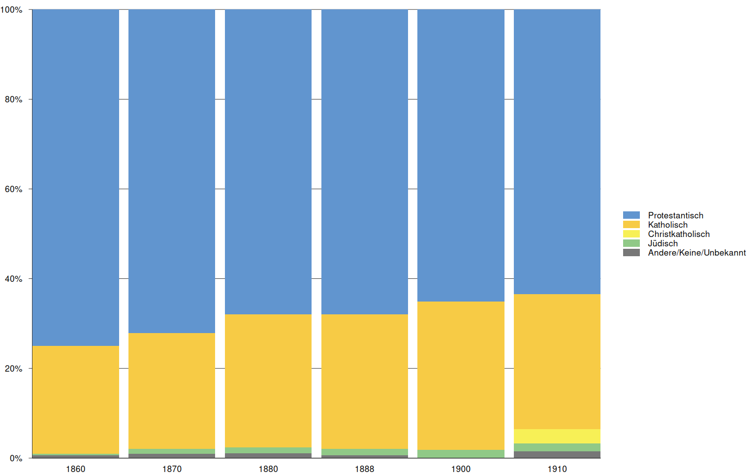 Description | Der Anteil der Protestantinnen und Protestanten an der Bevölkerung verringerte sich von 75 Prozent 1860 auf 63,4 Prozent 1910. Im gleichen Zeitraum stieg der Anteil der Katholikinnen und Katholiken von einem Viertel auf einen Drittel und die jüdische Bevölkerung vergrösserte sich beinahe um den Faktor fünf. |